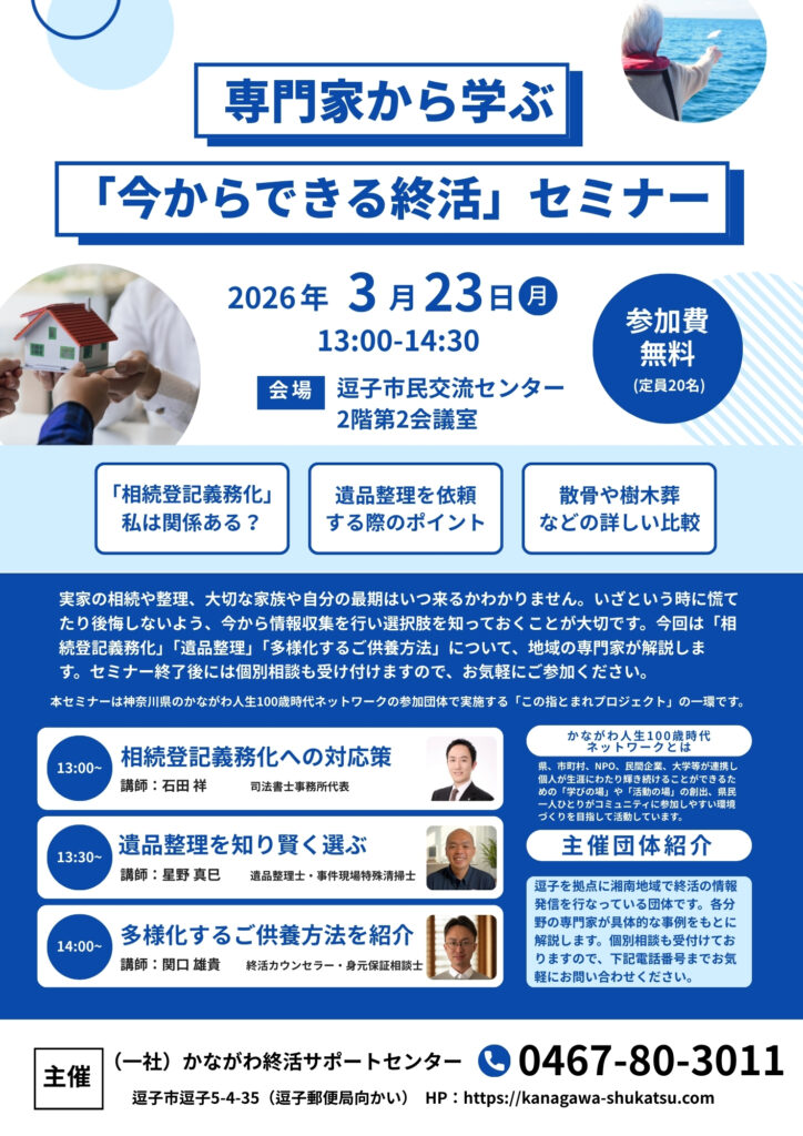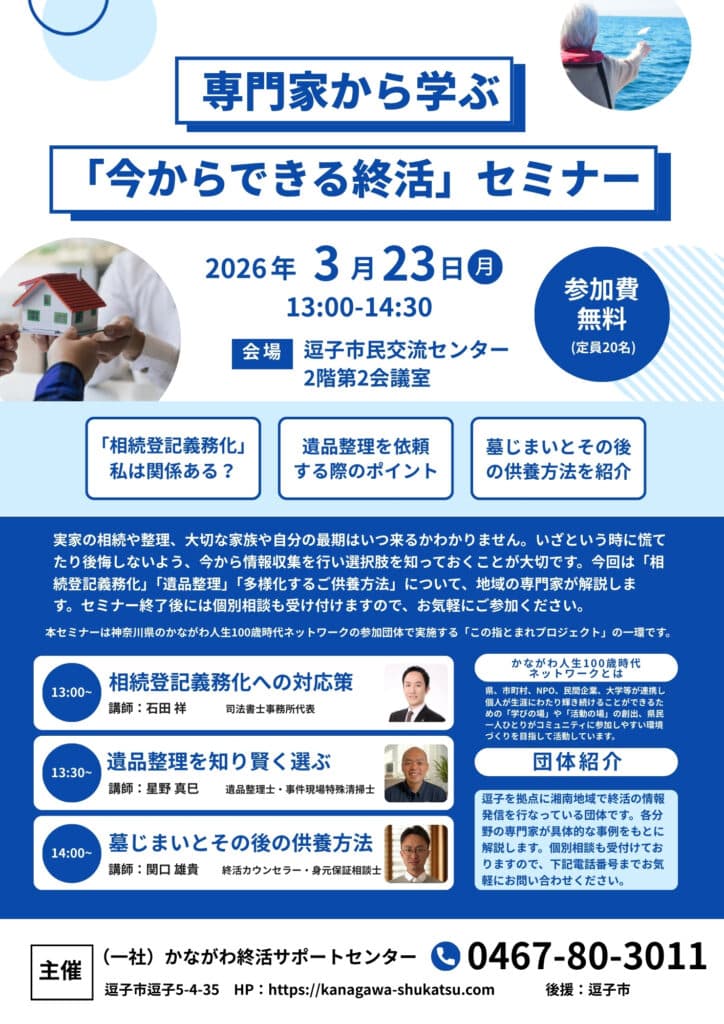 一般社団法人かながわ終活サポートセンターは3/23(月)13:00〜14:30、逗子文化プラザ市民交流センター2階第2会議室でセミナーを開催します。