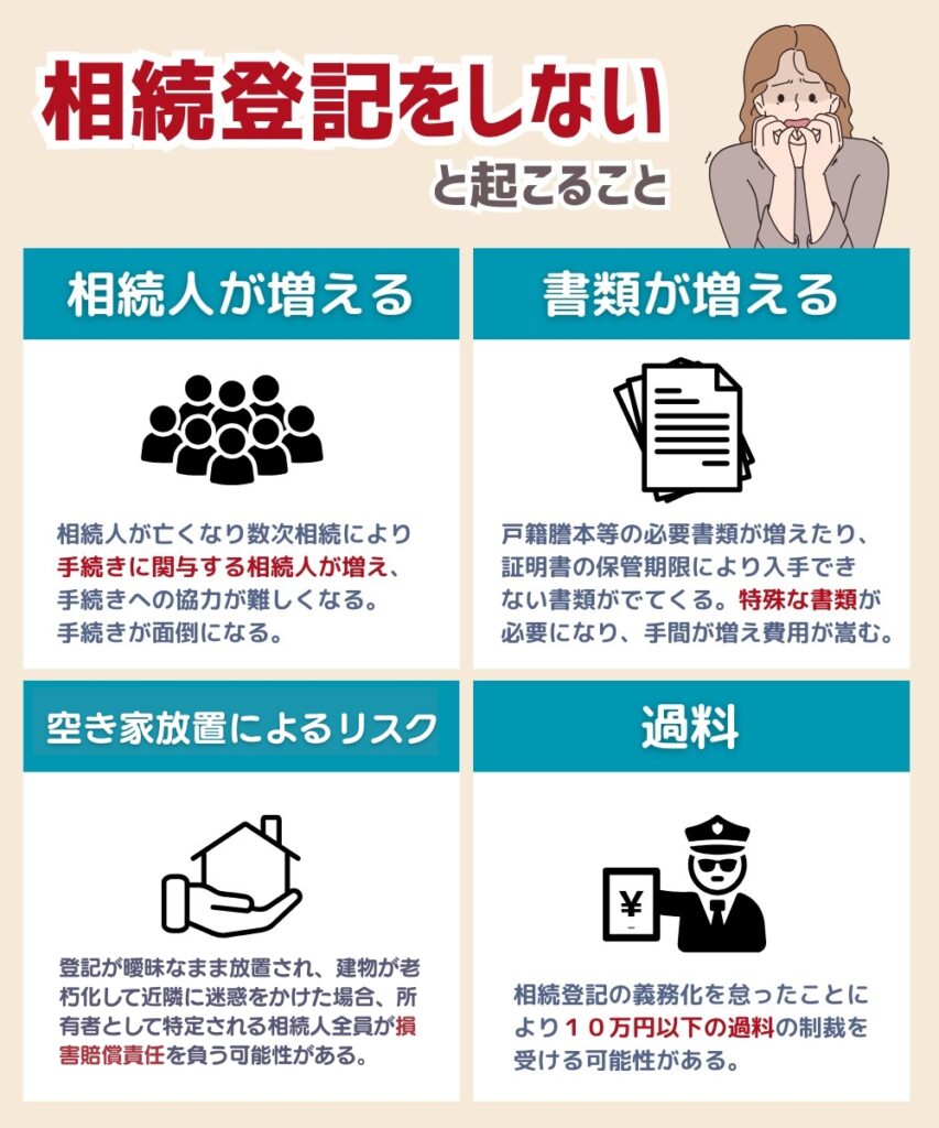 相続登記をしないままにしておくと、さまざまな問題が起こる可能性があります。